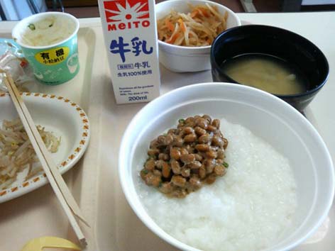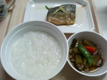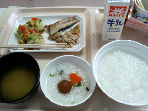 あれだけ苦しんだ熱が嘘のように、今朝の検温では、な、なんと!!! ありえるのか!寝巻きは汗びっしょりだった。しかも点滴といっしょに始めた飲み薬は食欲増進効果があるという。ラッキー!んで、じゃーん。朝ごはん! My温泉たまご付き! そして鯵の開きは左手の片手にとっては難関中の難関。だからこそ燃えるのかもしれない...1時間15分後...時間はかかったが、久々に何かに対する達成感というものを感じた。食事が出来るということはこういう気持ちなんだと、あらためて思った。 な、なんと向かいの人の牛乳まで横取りしている勢いだ!1月12日朝食メニュー・常食常菜(+温玉+牛乳2本)
