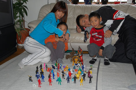 今日は待ちに待った九きょくせんたいオーマンの登場だ!実はなんとわざわざ仙台からブログ友達の航勇さんがお見舞いに来てくれたのだ。じゃジャーん!!! この勢いでMissyの中のがん達と戦ってくれるために、日夜練習を積んでいた九きょくせんたいオーマンクリック!駄菓子菓子!!!!!!元気が無い!!!!! なぜ? 隊長 「どうしたんだい?隊員2号。こっそり隊長に話してごらん。」隊員 「...だって。。。かみなり様がいるから...できない!」全員 「ホントだ。忘れてた。」 どっひゃー!! たいへんだ、こんなかわいいんだもん、 たしかに。 取られちゃうよー!!!!!気を取り直してご飯食べよう。なれれば人間だ。怖くないよ。 ほらね。だいじょうぶでしょ。 おみやげもいーっぱいもらってたっくさんお話してとっても楽しかったね。この次は仙台のすずめ祭りでお会いしましょう。ありがとうございました。もう少しで元気になります!