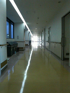 今日からはしばらく何の治療の予定も入ってないし、苦しい検査は来週にしてもらった。だから今はさんざん痛めつけられた体をいたわる時間なのだ。プリーズ。太陽のエネルギー。 北病棟7階廊下日当たり良好!そして隣のベッドの体育の先生は、もう退院したくてしょうがない。「こんな薄暗い病室に居ちゃだめ!」ってんで。二人並んで廊下で光合成。ぽかぽかして気持ちよかったー。NK細胞も喜んだね。
