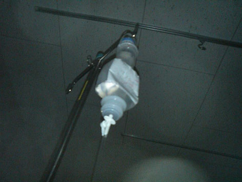 ついに来た。やっぱり逃げ切れ無かったよ。食道透視検査。もう内視鏡も終わったし、何の音沙汰も無いのですっかり気を抜いていたら。 「朝食抜きで食道透視のあとCT検査です。」 ダブルかー。待つこと1時間30分。まずは着替えて。 このままもっと垂直に立つ。障害者に自立は難しいが、やらねば終わらないのだ。 支えてもらう。鼻の穴から管を通す。前回右で鼻血が出たので今回は左から。そしてその鼻の管からデカイ注射器を使って これでーす。バリウムを流しながら食道を撮影するのだが、2人の先生と私と3身1体の息が合わないとすっごく難しい!ピーンと張り詰めた空気の中、「息を吸ってー。」 「止めてー。」「はい。」 「飲み込んでー。」「はい。」 「はいてー。」厳かに進行していた矢先、ごぼっ!げぼっ!がぼっ!ぐぼおっ?!!なんじゃあああああーーーーー???!!!!!突然検査室中がバリウムだらけ!私の体もバリウムまみれ!なんだ?何が起こったのだーーー!!!わからない!とにかく私は無事だ。逆流してきてるわけではない。「立っているのはつらいのでかまわず先にすすんでください。」終わったー。「いったい何だったんですかあああああーーーーー!!!!!?????」「あの暴発事件はあああああーーーーー!!!!!?????」「わ、わかりません。」そのあと2人の先生は大急ぎでお掃除していた。次の患者が待っている!肝心の食道透視の結果は。 これは例だが?自分で前のと比べてもわからなかった。でも先生いわく、「とーってもつるんとしてきてるよ。」と言ってくれた。駄菓子菓子。 疲れた。