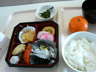 今朝はやっぱり日本人の基本、御節料理だった。そしてまさかと思ったが、じゃーん。 お雑煮もついてるじゃないかい!食道癌にお雑煮。危険だ。しかも最終段階で食道に炎症が起きていて喉につっかえ感がある。ええい!食べてしまえ!ここは病院だ何とかなる。今私はお雑煮が食べたいのだー!!!その後無事窒息することも無くブログを書いている。よかった。ブラボウそしてお昼。家に電話をかけたら。母が待ってましたかのごとく、また御節を持ってやってきた。 普段の日に「なんか今日、おせち料理食べたいよねー!」って言う人いないのわかる気がする。