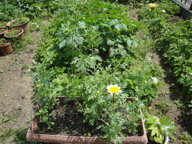 我が家も息子たちもGWとかあんま関係ない・・・GWは稼ぎ時・・・?そんな忙しい中4月に来れなかったからって今日長男家族が遊びに来ます。孫1が、学校なので終わってから・・ですが。庭は毎日大賑わい蝶々が来たり、トカゲが走ったり~ブンブンミツバチもご出勤周りでブンブン飛ぶものだからつい振り払いそうになりあ、やばいよやばいよ~これが蜂と敵対する元だ・・・恒例の春菊の花が咲きました。冬が厳しかったので生き残ったのはこれだけ・・・色々種を蒔いていましたが庭での冬越しは、なかなか難しかったですねぇ奥に見えるのは青々としたジャガイモの葉っぱ右手は何も植えずに放置してたらワイルドストロベリーが我が物顔に勢力拡大!ワイルドストロベリーをポイポイ抜いて29日に、キュウリとトマトの苗を買ってきたので植える場所を確保しました^^今年も美味しいキュウリとトマトをたくさん食べます3年前くらいに植えたモミジが今年は青々として、とても綺麗夏にはいい木陰を作ってくれそうです^^引っ越してきた当初は、裏手には休耕地が広がっていて遠くに雉の姿など見えたのですが今年は近くでウグイスさえも泣きません見える範囲でどれだけ木を切ったのかなぁ切るなら隣の杉の木と、檜にしてほしい・・・ほんとアレルギーが辛い・・・ようやく開き始めたオルレヤ秋に種をばら撒いておいたのがニラを押しのけ咲き始めました( *´艸`)いたいた!ブンブンの主蜜集めに、大忙し^^ここの右手を少し掘り起こして腐葉土などを漉き込んでおきました。ここにもキュウリの苗を植える予定です^^夏にはまたでっかいキュウリがフェンスにぶら下がってくれますように・・・秋に種まきをして育てたビオラ達が最後の艶姿なんか余計なのも顔を出してますが^^;古土をリサイクルして使ってるのでこぼれた種が期せずして芽吹きます最終的にはどんなプランターになるのか予測不能^^;今年のクレマチス誘引を広げたのがイマイチですたぶん植木鉢も小さくなって窮屈なのでしょういい時期に調べて植え替えましょう去年から思ってたけど・・・にほんブログ村にほんブログ村パネル付き収納庫 100(YB-202NW100)収納庫 ガーデニング 収納 カントリー 木製 庭 園芸 エクステリア ナチュラル 棚板調節 パネル付【ポイント10倍】2ウエイフラワースタンド 2段 JSFS2-800【二人掛け 天然木 木製 椅子 チェア 玄関 庭 バルコニー ウッドデッキ 屋外 小型 ガーデニング フラワーラック プランター台 おしゃれ カントリー ブリティッシュ 北欧 ナチュラル 家具】LEDランタン pos-22419/ガーデニング・ライト・カントリー雑貨・ジャンクガーデンに/シャビー加工【箱80】/ギフト/プレゼント/母の日【BREA】【カントリー スタンド ホワイト】2段 花台/フラワースタンド/プランタースタンド/木製/男前/西海岸/ブルックリン【ポイント10倍】【組立式家具/ステップ付】《SMST》デッキ縁台 180×90 ステップセット DE-18090STPベランダ オープンタイプ ガーデニング 天然木 北欧 木製 人気 おしゃれ ナチュラル 西海岸 カントリー レトロ アンティーク 屋外 de-18090stp