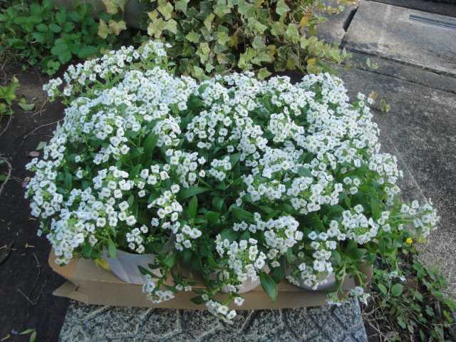 先日 駐車場と道路の仕切りにしてるプランターを植え替えようとスイートアリッサムを買って来ました1鉢98円×6鉢まぁこんなもんかなぁネットで見たら150円前後してるので・・・関東地区って全般に花苗お高いのかな相棒は裏庭にこぼしておいた冬知らず洋風の名前もあるようですが私は冬知らずという名が好きです黄色い花はそれほど好きというわけではないのですが懐いて居付いてくれた植物は可愛がります^^大きくなると思うので隙間あいてるけどこれ位で良いかと思います植え替えてる間も小さなハチ?アブ?が、花にとまっていました甘い、いい香りだものね^^1日目は1プランターだけ疲れちゃった・・・翌日あと2鉢で計3プランター夏の間はレモンの香りのレモンランタナ疲れた原因は、端に植えてるアイビーしっかり根を張ってて引っこ抜くのに尻もちついたりしてたからけっこう力仕事だねぇ抜いたアイビーは株が大きくなりすぎてて入れる植木鉢も無くてしょうがないので、プランターの古土を入れた土袋に埋めちゃいました地植えにしたらきっとあちこちはびこるだろうなぁと思いつつ捨てられない私です^^;そのうち株を分けて何とかしよう!まぁさすがに目立つ場所に置いてるのでそのうちどこかへ・・・レモンランタナは挿し木をして部屋の中へ寒さに弱いのでここで冬越し今年は挿し木が遅かったので育つかどうか一緒に写ってるのやその下の画像は、2月に私が食べたポンカンの、種を1番水につけておいて蒔いた物3苗すくすく?と育ちました実が生るまでには10年位かかるそうですが寒さに弱いのでレモンランタナと一緒に冬ごもりです^^今年は部屋に入れるのはこれだけにしましたあとは軒下とかで防寒してあげようかなと思ってます枯れたらしょうがない~だんだん減らさないとね以上冬ごもりの記録ですにほんブログ村にほんブログ村◆アリッサム(スイートアリッサム)ホワイト 白 苗 9センチポットスイートアリッサム混色植え3株セット♪色とりどりの花色【花苗】【アリッサム】【コンテナガーデン】/販売/通販/種類花苗 アネモネ ポルト ブルー 青花 3.5号 苗 耐寒性強 寒さ強い 10.29宿根草 バラ咲き プリムラ ジュリアン ブライダルベル 1株 花苗 冬咲き 苗 鉢植え 庭植え ガーデニング 寄せ植え等に 花の苗花苗 アリッサム 多色寄せ植え 苗 3.5号 冬の花苗 耐寒性 花壇苗 10.15ビオラ&アリッサムミックス植え 苗 ビオリッサム【広島の優良農家さんの苗】【花苗】【超早期予約苗】 花苗 ビオラ 川越ROKA 結(ゆい)サーモン 結サーモン 個人育種 育種家ビオラガーデニング ガーデン 雑貨『ローズ!ストローハット』ガーデニング雑貨 ガーデン 寄せ植え ローズ【NEW】『オールドローズ☆ボウル』