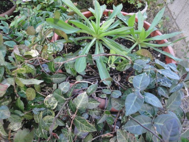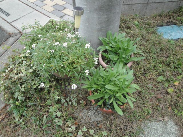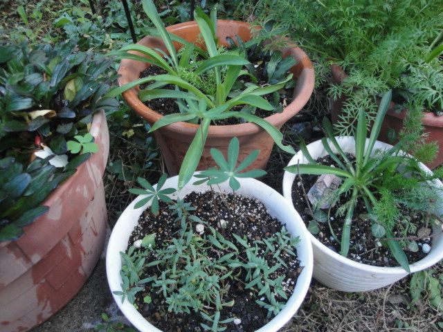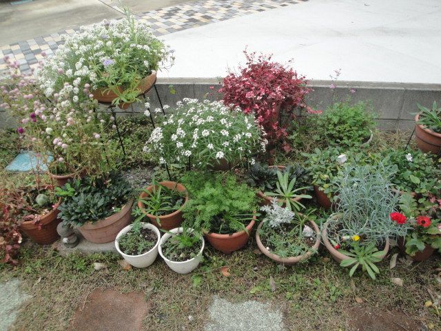 挿し芽して育てたシロタエギクや、ハツユキカズラも見えます。
