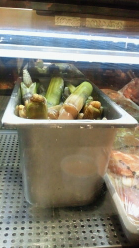 カウンター席でランチを食べていました目の前には冷蔵ケースがその中には、夜の部に使用されるらしい鶏肉、豚肉等がマリネされていますそこにこんなものもマテ貝です今夜の催しに使われるとか生きていたらしく、時々、ピュッと水を飛ばしていました(笑)ガラス越しですが、思わず身を引いてしまいました(^-^;しかし、新しい写真の扱い「大」か「小」しかなくてホント使いにくですねー大きくするとこんな感じに粗くなってしまう・・・・