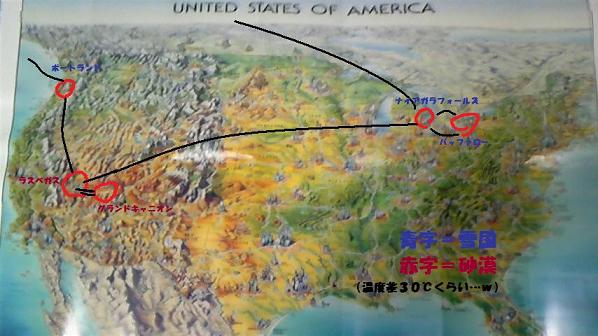 こんにちは霧です。さっそくレポレポ!明日からは社会復帰しなきゃだから書けない気がするから今日のうちw初の海外ツアーだったのですが、これが意外とすごいルート。冬と夏を4泊6日で味わう感じ。とても個人じゃ行く気がしないぜ…w地図に書いたルートちょっと間違えてるけど気にしないでね♪服とかすごく困ったので夏服と冬服どっちも持って行ったとさ空港での装備品がマスクに麦わら帽子にブルゾンコートとかもう変人でしかないw成田空港はマスクしてる人が多かったかなぁーでも日本人ばっかで外国人はひとりもしてなかったですというか日本は騒ぎすぎ。確実にこれは言えると思うよまぁ、豚インフルの話は置いておいて…まずはデトロイト空港まで約13時間ほどのフライトです。窓側の席だったので寒かった…海外初の母は心配してたよりも大丈夫そうでした。とにかく寒いので余計にひざかけを持って行って正解でした!そしてデトロイト空港、でかいです。前に来たことあるけど、最初は広すぎて怖くて散策できなかったwそしてさらに乗り継ぎで3~40分のフライトでバッファロー空港に到着シ●ィバンクの本店があるとか聞いたくらいでこの街のことはよくわかりませんw添乗員さんいわく「その昔この一帯にはバッファローがたくさん住んでいたから」ではなくて最初の領民?のフランス人がこのあたりを流れる河を見て《美しい流れ》の意味の名前を付けたのが始まりでのちにやってくるイギリス人がそれを聞いてバッファローと英語っぽく街の名前につけたらしいぶっちゃけ半分寝ながら聞いていた話なので正確にはよく覚えてませんがwニュアンスたぶんそんなかんじそこからバスに乗ってしばらくすると…大きい河沿いになにやら温泉地のごとく煙がもくもく…なんと河はナイアガラ川でナイアガラの滝の水しぶきが立ち上っているのだとか。しばらくすると滝が小さく見えてきたんですが、時間があまりにも遅くてライトアップイルミネーションも終わってるためよくわからず。そしてバスは橋を渡り川の向こう岸へ…ほんと直前まで知らなかったけど、カナダにも入国するのねこのツアーw渡った橋はレインボーブリッジといって、橋の真ん中にアメリカとカナダの国境があるために入国審査を受けなくてはならないので、一度バスを降りました。見えないけど滝の音SUGEEEEE!!音だけで気分盛り上がりましたwそしてカナダ側へ入国し即効ホテルへスカイラインインというホテルです。屋内なのに屋外のアパートにいるみたいな面白いホテルでした♪そんなこんなで1日目は移動日!夕方というか夜日本を発って16時間くらいたったのに時計は6時間くらいしか経ってないっていう長い一日wとりあえず2日目は中身多いのでここで区切ります。。。