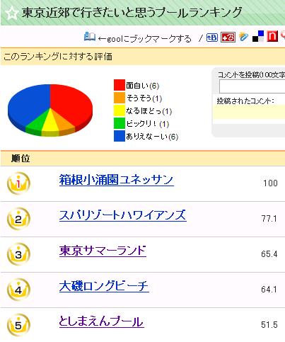 こんにちは★なんとか月末月初年金日終えました、なんかちょっと痩せましたよ(;・∀・)さて、オフ会の日中の場所探しをしていたらこんなものを発見。ありえなーいwww地元4位とか(;´ー`)あそこで4位なら東京って結構面白いところって多くないのか・・・っていうかまず東京近郊じゃない所多すぎだと(ryとりあえず時間がないので、ありがたーくこのランキングを使わせていただいて調べてみました。やっぱり遠くから来る人もいるし、ちゃんとしっかり遊んで帰ってもらいたいと・・・!まず、ユネッサン(箱根)とハワイアンズ(いわき)は遠すぎワロスwなのでアウトロングビーチととしまえんはプールしかないのであんまり泳ぎたくない人のために避けます。残ったのはサマーランド…これはかなりいいテーマパークですね。http://www.summerland.co.jp/index.htmlプールもあるし遊園地もあるしゲーセンもあるしボーリングもある!ただね、こんなの見つけちゃったよこれを見てください((((;゚;Д;゚;))))http://www.nicovideo.jp/watch/sm877653まさかこんな混むことはないと思うけど・・・まぁこんなに混んだら他のアトラクションに逃げればヾ(;´▽`A``アセアセまぁ、お盆の行楽地はどこもこんなんですよきっと^-^とりあえず特に嫌過ぎる!!!って人がいなければサマーランドで決めようかなと思ってます。参考までに東京についてから翌日東京から帰路に着くまでに最低かかるお金は・・・東京駅→サマーランド(電車+バス)1時間30分~1,030円サマーランドフリーパス4,500円サマーランド→新宿(電車+バス)1時間11分~840円飲み放題付きコース4,500円新宿→泊まる場所400円泊まる場所→東京230円なので…合計11、500円ちなみに算数間違ってたらごめんなさいw大体東京から発って東京帰ってくるまでがこのくらいです。※ちなみにお昼代や朝ごはん代やお土産代は入ってませんwサマーランドのフリーパスはチケットショップでもうちと安いのないか探してみますヾ(・ω-。)集合場所と時間は人それぞれになると思うので各自ご連絡します詳しい内容はメルで質問受け付けてます!うん、このくらいでいいかな!じゃあ炎天下のなか絵描いてきます♪