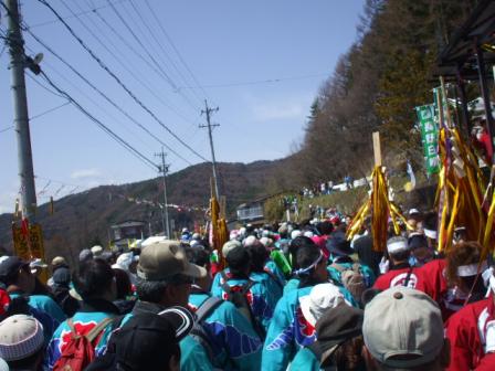 4月10日、諏訪大社下社の御柱祭、山出しに参加してきました。もうこれで何回目になるのか?4~5回目だと思うのですが今回は朝から人が大勢いて大混雑でしたが、天候にも恵まれて楽しい一日を過ごしました。曵行したのは「秋宮四」の柱、柱の大きさの割に引っ張る人が多いので、私はただつかまっていただけで、どんどん進みます。午前7時から曳き始めて、十時半には昼の休憩です。休憩直前の写真そして午後からは最大の見せ場「木落とし」です!木落とし坂の真上にある「碑」です!天下の木落とし坂!そして坂の下をのぞくとこんな感じです!ついスーパースターになった気分で、柱にとび乗ろうとする気持ちがわかります!以前はそんな元気もあったのですが、最近は人も多く、けが人を出さないように警察・消防で規制をして近づけません!そんなわけで、坂の下から木落としの瞬間を待ちます!最大斜度35度!歩くのもままならない急斜面です!木落としの瞬間!?・・・落ちた後?人が集まっています!今日は何キロ歩いただろう?やっぱり家でテレビ中継を見ていたほうが良かったかな?と思う今日この頃のみときちでした。今年の人出は53.6万人、この日1日で23万人とか、昔は良かったと思うのは私だけ?