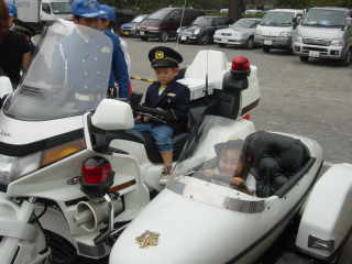 今日は近くで「ど~んと祭り」れおっちは昨日から実家お泊りで不在wなので、ママ&かいどん&まなりん&パパの4人で行く地元のあらゆる企業・団体が多数参加するこの祭り他にもマジレンジャーショーやフリマもあったりしてたくさんの人が訪れる早速、フリマを廻ってみるかいどんは今仮面ライダー555がマイブームなので、携帯付きベルトや銃など格安で手にいれたその他にもいろいろもらったり、食べたりしました♪そうそう、警察の方も祭りに参加してて、子ども用の制服着せて白バイ乗った写真撮れるんですサイドカーにまなりん乗ってますw↑の隣にも普通の白バイがあって、写真撮れたんですね素敵な美人女性の交通機動隊員?がいて、かいどんらと一緒に入ってもらって写真撮ろうと思ったのだが・・・かいどん、まなりんは何故か拒否・・・・これが、今日いちばん・・・アッタマきたパパだった!(;`O´)oこんなことで怒るなって・・・・・( ̄∇ ̄;byママ