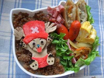 こんにちは~今日もプルチチさんよりリクエスト弁ワンピースのチョッパークレープ生地でキャラ作りの師匠いっくんママさんのように今日はHKM使用の甘い生地で作ってみましたイヤイヤ~(;´∀`)・・・難しぃクレープ生地なんてキレイに焼けた試しがないのでHKM使ったら生地が厚くなってカットがめちゃめちゃ難しかった~帽子とパンツ、焼いた生地けっこうピンクだったのに写真撮ると赤にしか見えないよぅ Σ(゚д゚lll)ガーン参考資料(ウチにあったキーホルダー)チョッパー(食紅赤・青入りHKM焼き・ココア入りHKM焼き・カニカマ・マヨネーズ)鶏そぼろご飯春巻きビアソーセージのお花ハートの赤ウインナーハートの卵焼きじゃがいもと人参のバター炒めキャラ弁ランキング参加中ですテレッ☆(ノ)'ω`(ヾ) ランチ流コンテストも開催中~ぽちっと♪(´∀`*)応援宜しくお願いします~ template-まりもん img-candied