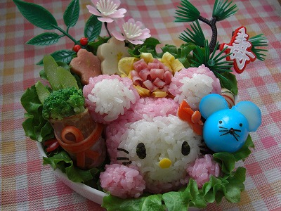 本日2回目の更新ですっ今日はパパ弁寝坊でキャラなしみう弁は~今更ですが…お正月ネズミのかぶりものキティちゃんアップでホントはのかぶりもの青でネズミだったんだけどご飯に直接青の食紅入れるのに抵抗があってやめましたやっぱりピンクだとネズミに見えないなぁブロッコリーとアスパラ、ベーコン、カニカマで門松風にキティ(おべんと畑梅・海苔・薄焼き卵・赤ウインナー)門松(アスパラ・ブロッコリー・ベーコン・カニカマ)レモンハーブ焼きチキン(キティの後ろ)薄焼き卵とビアソーセージのお花ネズミ(鶉の卵・食紅青)お正月お麩(お花・鞠)キャラ弁ランキング参加中です 一日一回ずつぽちっと応援頂けると嬉しいです(´∀`*) +まりもん+