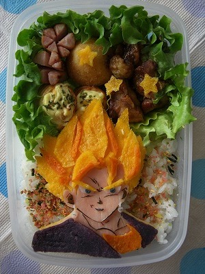 d(*ゝωб*)コンニチワ♪今日のパパ弁はプルチチさんのリクエスト ドラゴンボールの超(スーパー)べジット(画像暗いっ(;´Д`) )悟空とべジータが合体してスーパーサイヤ人になったやつですねぇ髪の毛雑だしパパに超ダメ出しくらって凹み中のMIUMIUなんで似てないの~(・ω・;)?…と思ったら目の海苔ラインを忘れてた… Σ(゚д゚lll)ガーンこんなゆる~い感じで…どうっすかプルチチさ~ん(笑)べジット(ハム・薄焼き卵・ケチャップ入り薄焼き卵・海苔 紫芋粉入り卵白焼き・チーズ・カニカマ・煮昆布)鶏肉の照り焼きちくわのチーズマヨ焼きポテトインチーズウインナーブログ村キャラ弁ランキング参加中です ランチ流お弁当コンテストも開催中~応援宜しくお願いします~゚.:。・*テレ(*'艸`*)テレ*・。:.゚ +まりもん+