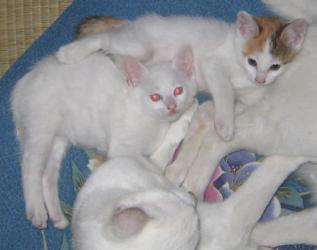 ところで、そのうち1匹の白い方(♂)の瞳が赤い。