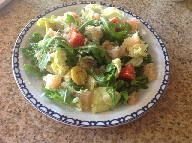 昨日お昼に食べたサラダ バターレタス アルギュラ じゃがいも トマト グレープフルーツ ドレッシングは、 グレープフルーツとレモンの絞り汁 オリーブオイル 塩、こしょう を適量