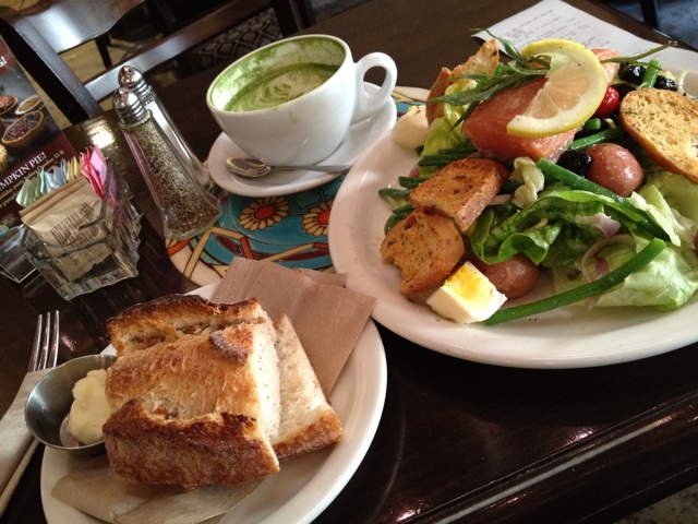 アースカフェでランチ❤ ニコラスサラダ サワドーブレッド 抹茶ラテ サラダだけで$20近くしたけど、美味しすぎて感動! バターレタス レッドポテト いんげん 赤玉ねぎ ミニトマト オリーブ 二種 スモークサーモン ゆで卵 ガーリックラスク