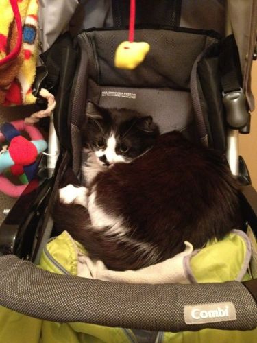 いつものカゴにも段ボール箱にも布団にもネミさんがいない……。どこへ行ったのか?と思って探していたら、玄関のベビーカーの上に!「わたくしのために椅子を用意してくれてありがとうですわ!」
