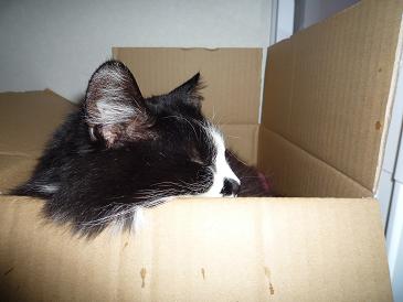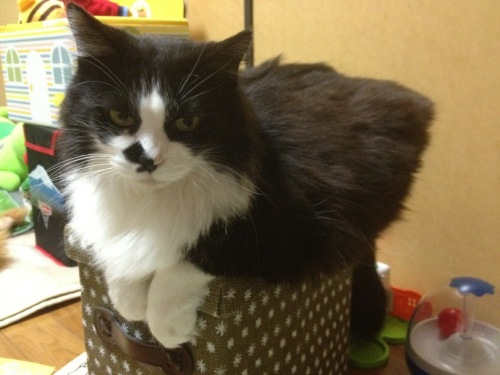 箱の上に乗るネミさん。小さな箱の上に無理矢理乗るので、体がはみ出しています。でもそれが可愛い!(*´▽`*)