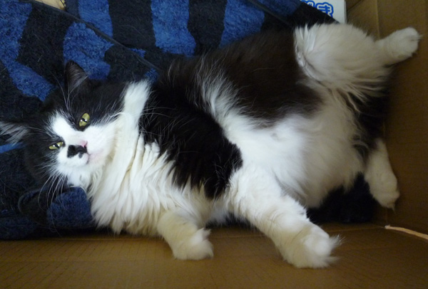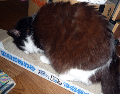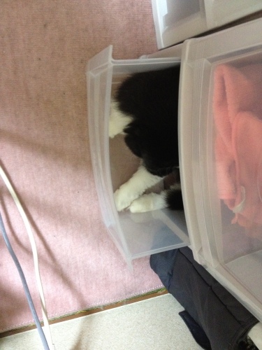 ネミさーん!いつも居る場所にどこにも居ない……いったいどこへ!?ややっ、ここは……いつもはネミさんのトイレの砂を収納している引き出しですが、掃除した後で仕舞い忘れていたようです。なにやら見慣れた模様が……。「ん? 何かご用でして?」いえいえ、気に入ったならそこでおくつろぎ下さい!!自分の居心地の良い場所を探してゴロリするネミさん。たまらん。