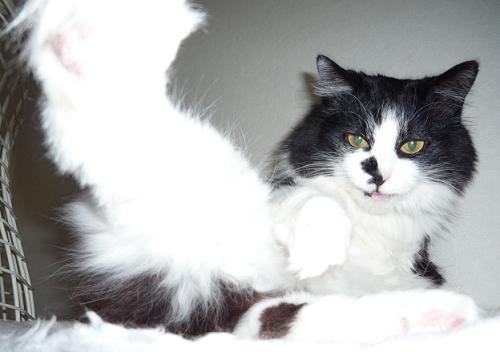 私の席は暖房が直撃するので、よくネミさんが椅子の上に乗ってきます。そうすると、私が座れなくなるので、ネミさん専用の椅子を献上しました。「居心地よろしくってよ」(……あ、いえ、捨てる予定だった椅子なんですけど)寒いときはあまり身体をオープンにしたくないようで、冬は丸まっていることが多いです。そんなネミ様、暖房を入れると毛繕いを始めます。こんなお姿も!
