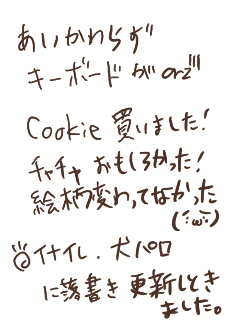 25日が楽しみでしょうがないです!!クッキーの発売日ですよはははははっは!嬉しすぎてテンションがおかしくなりそうですけどwwwwwwwwwwクッキー五月号に赤ずきん読み切りが載るだなんて買わざるをえないじゃないですかwwwwwwwwwwwあー楽しみ!!早く25日にならないかなぁ!wktkwktk!23日に新しいお家へ移動ができるようになりましたー!うひょう!楽しみだああああああ!!ホントに楽しみな事ばっかだな。ある意味リア充。あ。1日までに書かなくちゃいけない書類書いてない^p^めんどいぜ!^p^そうそう。フリペの「犬パロ」に落書きを一枚更新しておきました。ではでは。また明日^^ノシ☆