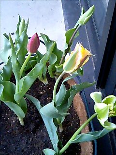 アちゃんは寒い中いきました。朝は雨もふっていなくて よかった。。もう今頃はホテルについてます。 11時半ごろにはお昼 (サンドイッチにしました) 思い立って、またホームセンターへ。。車がきてから買い物が多いですね。 近くにいろいろホームセンターがあって、最近でかけていなかったところへ。。 そこは以前はたしか小物もあったと思ったのですが、、今は園芸とペットに なっていました。 ペットはもう赤ちゃんみてしまったら。。めろめろに。。 かわいいダックスちゃんが5匹くらいいました。 ディもあんなに、、小さかったかな。。 そうそうに退散。。園芸のほうにいきました。 ここは結構充実しています。 この前ケイヨーでかったミリオンベルもありましたが、、花がまだついていない 若い苗だったので、パス。 チューリップの寄せ植えの花がほしかったので、、。 うろうろ。。くるくる。。。 結果は。。。 から。。 あら。。。今度はチューリップが見えなくなりました。。 あらあら。。 車でかえるときに。。花がとれていたのをちょっといたづら。。しました。 さて、今日は ”今日のごはん何?”っていつもいうお姉さんがいないので、、 おねえちゃんとディと3人ですが。。お姉さんはいつかえってくるのだろうか。。 午後からは冷たい雨です。 ほんと寒くて暖房つけました。。。 ゆきふってるかなあ。。。 ☆ アちゃんいないの。。さみしいの。。いってらっしゃいをベランダから しました。。いつまでもこっちをアちゃんはみてました。☆