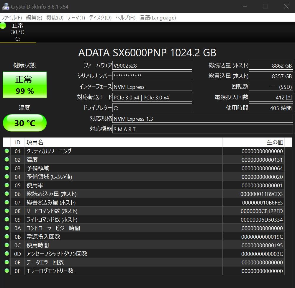PC立ち上げたら音がした。確認したらCrystalDiskinfoの表示が今まで100%だったのが99%になったこれってちょっぴりパフォーマンスが落ちたってことかしら?それとも他の要件かしら?壊れる前兆?調べなくては・・・・。CrystalDiskinfoの健康状態の見方SSDの場合はデータの読み書きの単位をブロックという形で持っています。このブロックもセクタと同じように使っているうちに劣化が起こります。SSDの残り寿命とはこのブロックの劣化数などを基にして算出されたSSDの残り寿命です。10%を切ると健康状態が注意になります。1%劣化したと思っていいのかしら?早すぎネ?