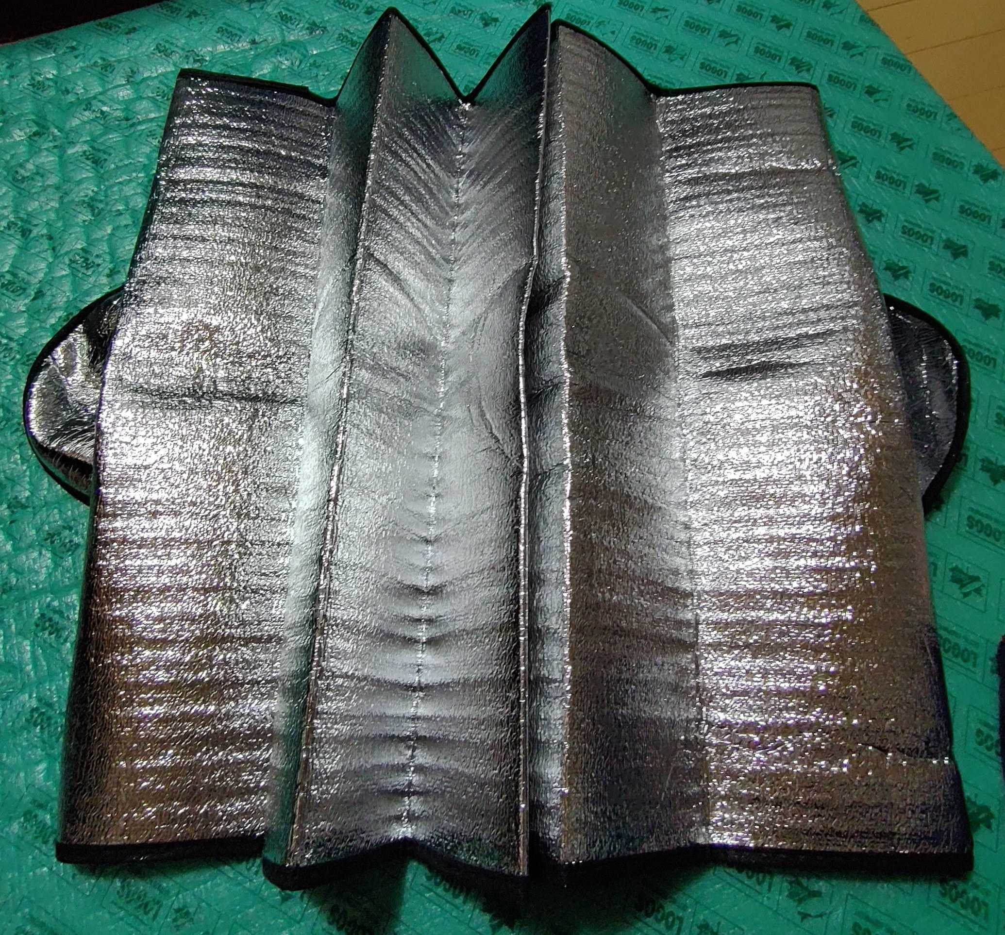 放浪するときはそれ用のものでフロントガラスからドアガラスまで覆っているそれはそれでいいんだけどドアの開け閉めに外れることもあったり、セットするのにちょっと手間だリアのスライドドアガラスとかは全部プラダンで覆っているこの際だからフロンドドアガラスもやってみることにしたまずは新聞紙でかたどりだこんなのは大雑把でいい次はプラダンをカットだ少し小さめにカットしてかまわないどうせアルミシートを大きめにカットして貼るからサイズはそこそこ適当でいいそうは言っても最初から小さめにカットするほど度胸はないちょっとずつ微調整のカットをして窓ガラスにゆる~くはまるようにしていくいい感じに出来たこれを2つ作ったらアルミシートをプラダンより1センチくらい大きめにカットして貼れば完成簡単だった2つ作っておしまい、、、のハズがなんと両面テープがあとちょっとで終わってしまったまぁ、残りは簡単な工程なので良しと95%完成だな