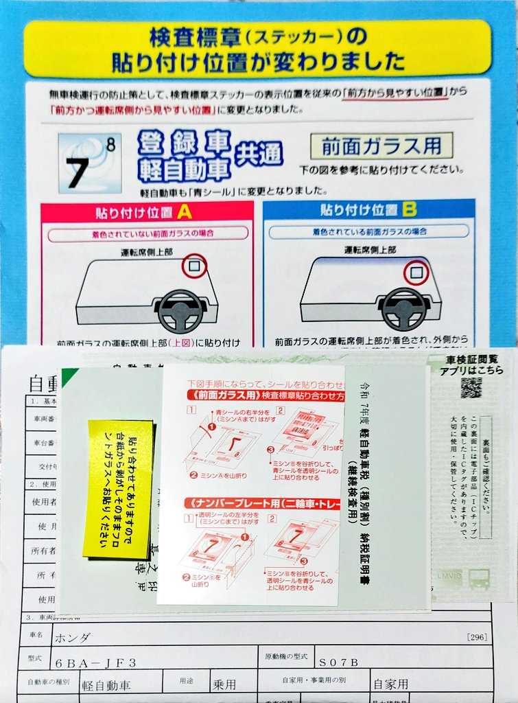 先日、車検して本日車検証が届いた随分小さい車検証になったICチップが埋め込まれてるらしいそしてフロントに貼るシールが右上に貼ることになったへたくそながら貼っておく