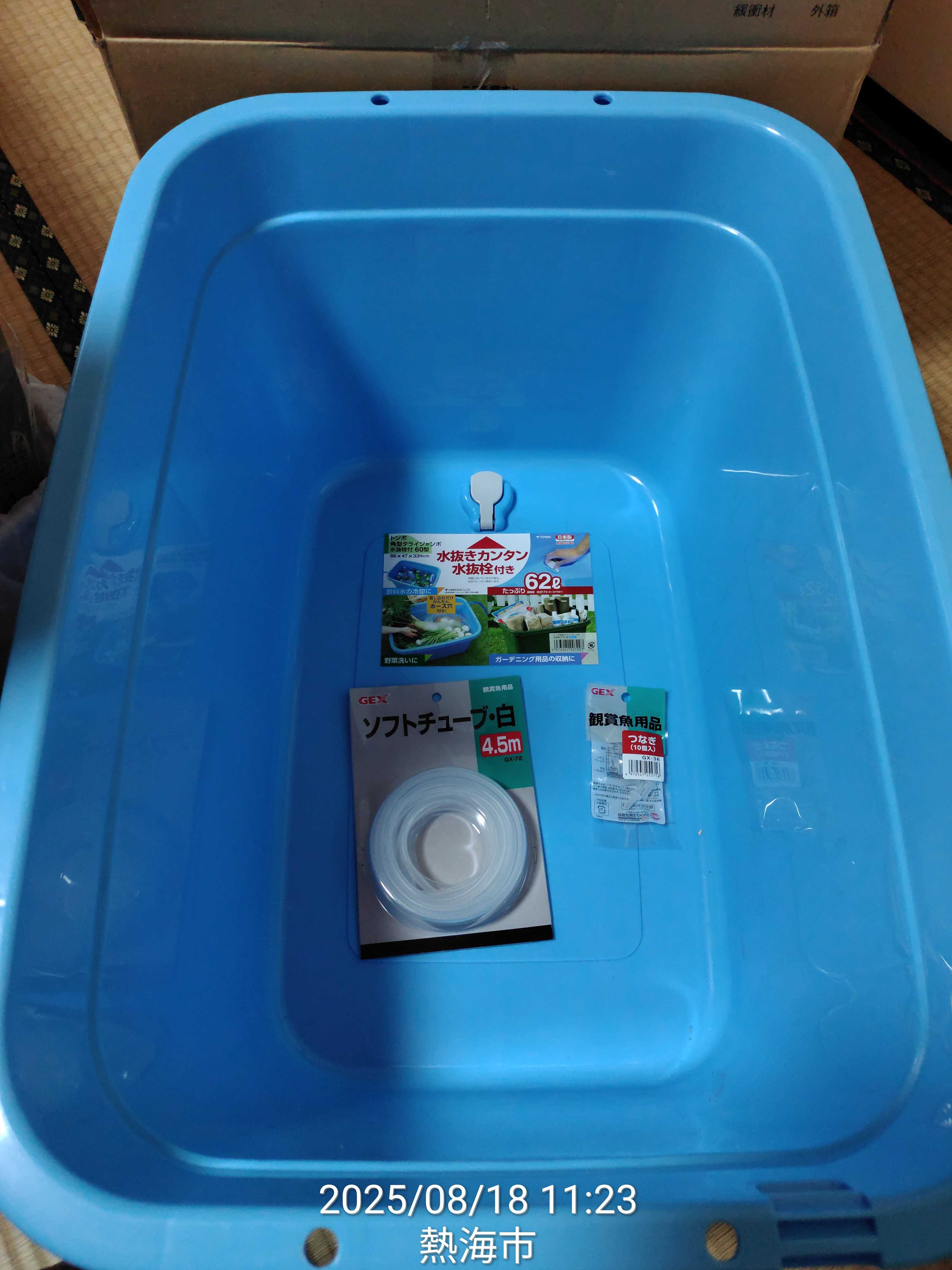 昨日届いたヤフオクで1000円引きのクーポンがきたのでついポチリとな今日、裏にセットしようと今ある62Lのタライとこれに板を通して板の上にも小さな水槽かバケツ、下には発泡スチロールの水槽を半分押し込んで、、、ブロックで少しかさ上げしたいので発泡スチロールのブロックを買ってこなくてはならない地元で売っていればいいけど100均にあるかな