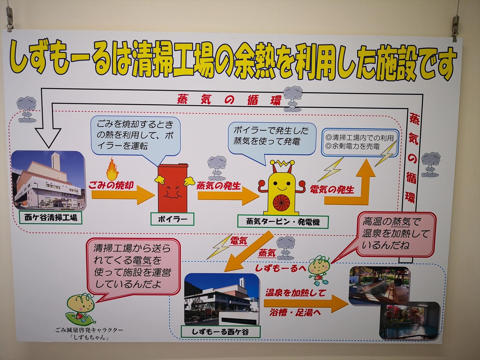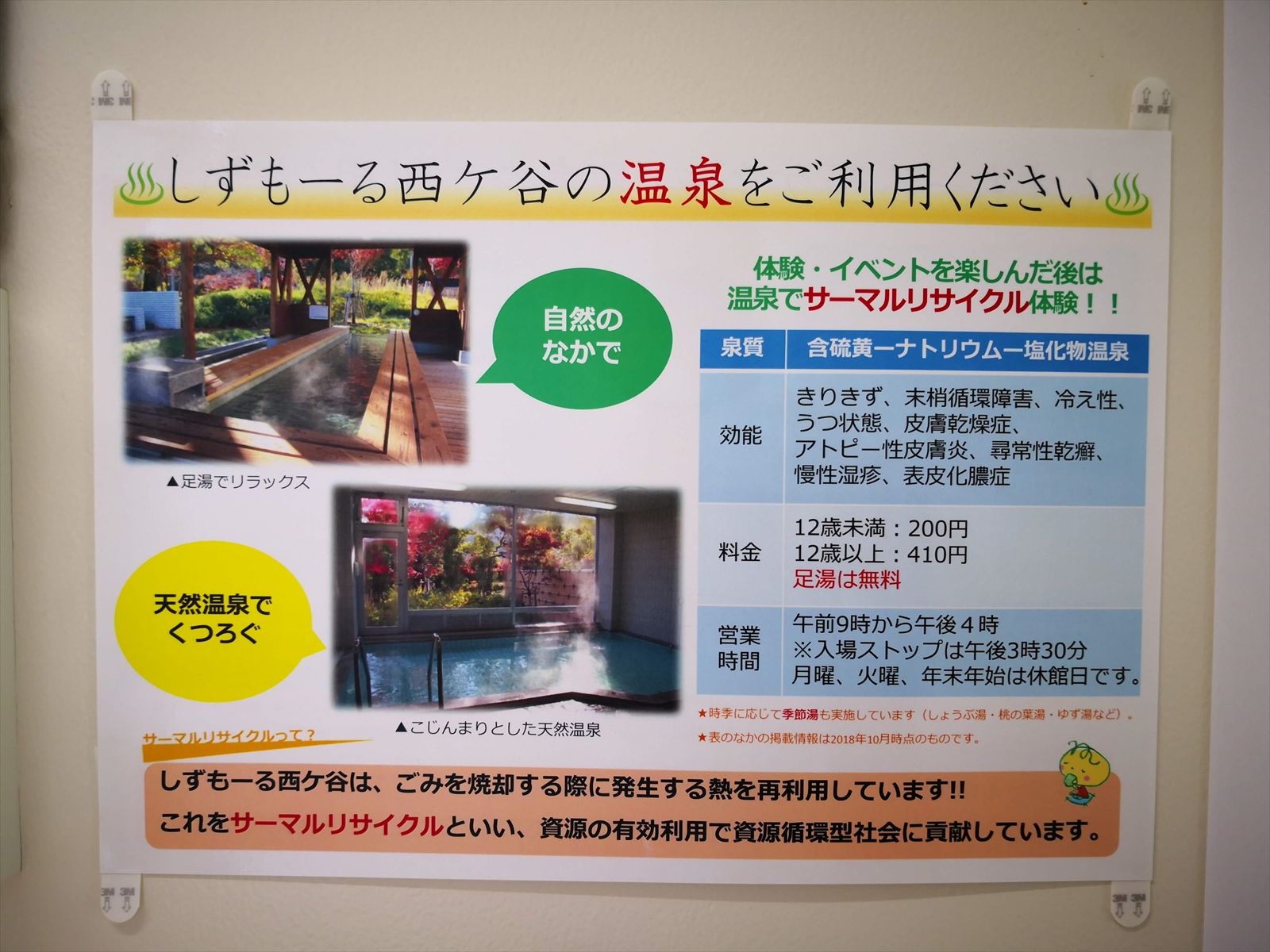 温泉を焼却炉から出る排熱を利用して加温しているらしい。