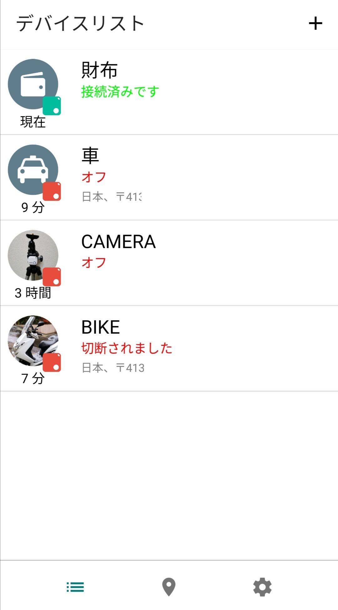 財布とバイクはいつもオン、車はとカメラはデバイスをオフにして節電だ。