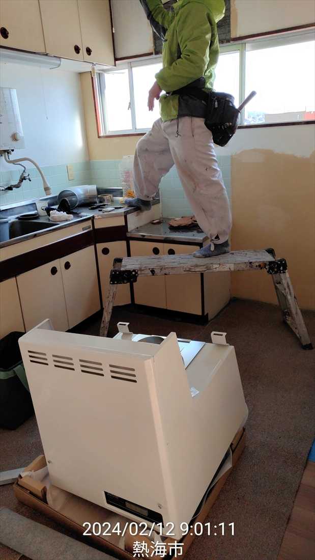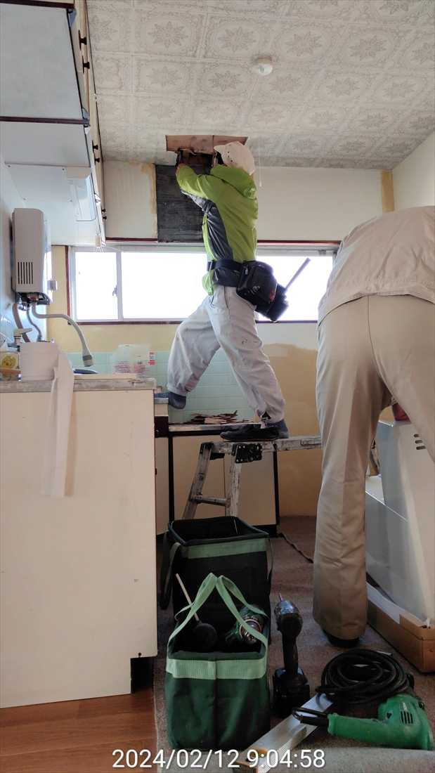 リフォーム屋さんも来てキッチンの換気扇の取り付け作業がようやく始まった