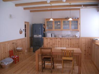 うちの床はパイン材。腰壁も同じパイン材です。1年経って床は傷だらけ。でもこれも味だと思って気にしていません!さすがにシミは気になるので、すぐに落とすようにしてますがテーブルの下にはちょこちょこ残ってます・・。パインの床は気持ちいいです!夏でもさらさらしてるし、冬は部屋が暖かいと床にも伝わって暖かくなります。うちの子はいつも裸足で走り回ってますよ~。そして壁は珪藻土。色は暗めの白?そんな感じです。リビングからみたダイニングキッチン。我が家は、床も腰壁も建具(ドア、扉)もすべてパイン材です