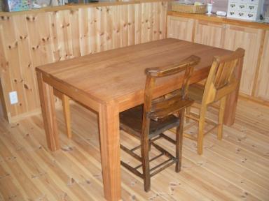 うちのダイニングテーブルです。サイズは1500×850チェリー材です。オーダーした時、ちょっとサイズ大きくしすぎたかな・・と不安でしたが、届いてみたらうちのダイニングにはちょうどいい感じでした。 リビング側にチェアーを2脚、キッチン側にベンチを置いています。レイアウトは時々替えます。テーブルの向きや椅子の配置などちょこちょこかえてます。テーブルはシミなどが付きやすいので、定期的にメンテをしなきゃ・・・なんですけど、うちでは何もしてません。。。もう1年経っちゃったし、そろそろやらなきゃ、と一応?思ってます。そしてチェアーは、他にも玄関や廊下にも置いてあります。うちは3人家族ですが、チャイルドチェアーも含めて何脚あったかな??かわいい椅子を見ると、つい・・。なので椅子たちの席替えもたまにします。他の椅子達はまた後ほど紹介します