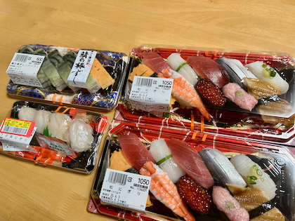 木曜日の話。夫が自室で超たくさんの作業をしていた。もともと外食予定だったのだけど、作業のカタがつくのが遅くなりそうだったので外食は無理っぽいな〜と、なのでパック寿司を買ってみた🍣こんなの ⬇️ たま〜〜〜に買う😆これは美登里寿司っていう、町寿司のお店のもの。都内に何店舗か姉妹店があり、けっこう人気みたい。たとえば渋谷店の昼時。40人待ちとかってすごいことになってるよ😂そこのパック寿司がスーパーでも販売していて、手軽に買える。夕方だったので、ツブ貝の握りは割引きシールが貼ってあった😍このほか、我が家では茶碗蒸しやお新香、お浸しを添えることが多いかな。日本酒と共にいただきました😊ちなみにですが、この画像を生成AIに読み込ませたものがこれ ⬇️全然違うだろ!!いやあ、ウケたわ😹😹😹😹