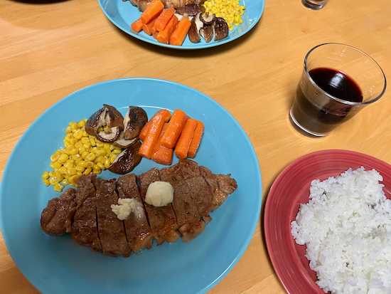 子供の頃、ステーキはビフテキと呼ばれていた。とても贅沢な食べ物で、庶民の口には入らない憧れの逸品だった。それが今では、手軽に食べられるメニューになった。お手頃価格の外国産が多く出回るようになったからね😊我が家もこんな夕飯を。サーロインステーキ約250g。付け合わせはコーンと椎茸をオリーブオイルでソテーしたもの。にんじんはグラッセにしたよ。肉は塩胡椒で味付け、最後にトリュフバターをのせました。焼き加減はミディアムで。ちなみに椎茸は冷凍してあったやつを焼いただけなんだけど、冷凍効果なのか?メチャクチャ香りが高くてトリュフが負けてた💦このお肉はオーストラリア産。オーストラリア産といえばひとつ引っかかることがある。肥育ホルモン剤の使用が不明確、ということ。なので、いっときはホルモン剤未使用のグラスフェッドを購入していたんだけど、当たり外れが非常に多い。複数のショップでお試しした結果、半分は外れた。楽天内で一番美味だったショップ(ヒレの6枚セットを2回購入し100%当たりだった)は閉店してしまい、他は微妙。そして地元のショップも微妙。微妙の定義は、獣臭や筋張っている食感、ところどころかみ切れない硬さ、などが主だったところ。だったら国産でいいじゃん、と思うのだけど、オーストラリア産には特有の旨みがある。だから今は穀物飼育のものを好んで選んでいる。すき焼きや焼き肉は和牛をいただく。ひとくちステーキも和牛が好きだけど、そこそこの大きさの1枚肉はオーストラリア産のほうが好み。しっかりした赤身のお味、適度に柔らかく分厚くてもぱくぱくいただける。結局は好みの問題なのですが😊能書き、いろいろ書いたけど美味しければいいということで💖💖💖😊