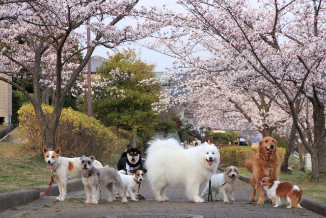 桜の花の下で、お散歩仲間の記念撮影会をしました。左から、ピュアちゃん、ベン君、小太郎君、リズ、キャンディ嬢、ビスキー、アンディ君、マロン君 です。 翌日の公園には、なんと久しぶりに「ロン」おじいさんが、ヒョコヒョコやってきました。長い間、公園まで来ていなかったので、みんな大感激です。 左から、マロン、ベン、ピュア、キャンディ、アリオン、ロン、アンディ、リズ、ビスキー、小太郎 です。撮影は、コタママ でした。ご苦労様でした。