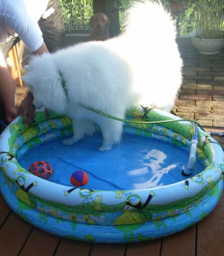 先日は、キャンディ家での「プール大会」に招待していただきました「小太郎」と「ベン君」も参加しましたが、お水は苦手です~~最後に参加した、アンディ君・・・・・レトリバーの血が騒ぐ~~小さなプールに頭を突っ込んで回転します結局、プールを満喫したのは一番大きな「アンディ」と一番小さな「ビスキー」・・・でした