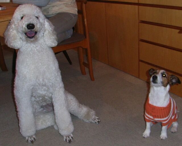 大変ご無沙汰しておりました我が家の 2WANは毎日元気に過ごしております。この2ヶ月の間に、ビス吉は確実に成長(膨張)を続け、すっかり「リズ」を凌駕してしまいました。特に 顔(態度)のデカさは、1.5倍以上あります。公園でも、いつも我がもの顔で走り回っております。皆さんいつも ゴチソウサマ・・・・・ゴメンナサイせっかくリズ姉が、買ってくれたお洋服も、ピチピチでした。おまけにこの後、2匹でGAWって、飾りボタンを全部噛み砕いてしまいました(号泣2匹だと、破壊力も2倍・・・・それ以上かも・・・・ON OFF の激しいところが まだパピコらしくて かわいいんですが・・・・・