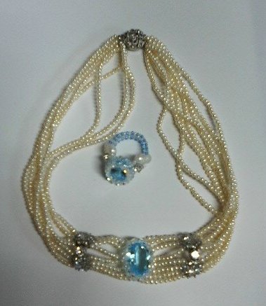 どうも画像がはっきりしないですね。腕が悪いのか、携帯のカメラだからなのか?7月半ばにパーティーが有りまして、その時着けるのにいいなーーと思ってつくりました。ブルートパーズ4石、サファイア1石、タンザナイト、淡水パールと、色々買いためていたルース等を寄せ集めて、考えに考えた結果、このデザインとなりました。素敵に見えるでしょうか。私的には、とってもたのしみです。セットでイヤリングも制作したのですが、プレスレットも同じような物を作ろうと思っています。