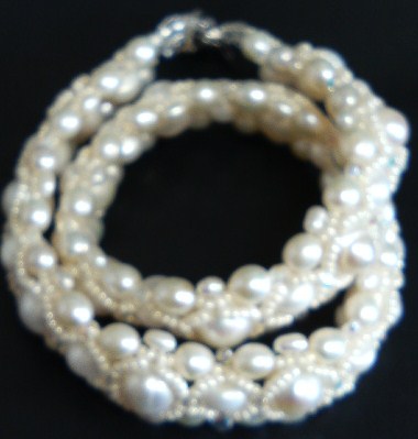 写真はボケボケですが。私の携帯、どう撮ってもボケるみたいこれは、淡水パールと、丸子ビーズ、丸スワロを使っています。甲府の宝石屋さんで落札した、10ミリ以上ある淡水をいろいろ加工してみました。色石のチョーカーだと、お洋服とマッチしない色が出てきて困るので、白ならどんな色のでも大丈夫かなと作りました。この他にオレンジ系のチョーカーも、同じデザインで作りました。前に作ったチョーカーは、キュービーックの台付を編みこんで有るので、セーターをきていると引っかかり、冬はチョット・・・だったので、今回はなるべく滑らかになるように努力しました。ところで5月の連休、ユニバーサルスタジオジャパンは、混雑するでしょうかね----今年は思い切って飛行機に乗っての旅行にしちゃいました。海外ではなく、国内旅行なところがポイントかな?お金も時間もあまりかけられないので、・・・ん-----たのしみ
