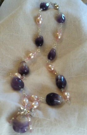 アップシマース。チョーカーとブローチです。ブローチは甲府の宝石屋さんから購入した、ラベンダー翡翠をセンターに使ってアメジストのペタルで周りを囲んでみましたチョーカーはアクアマリンと淡水パールとアクセサリー通りで購入したキュービック、それから、サファイアの糸通しから出来ています。今年はなんだか忙しく過ぎていきます。