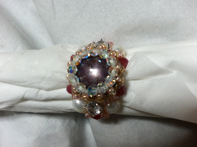 こんなリングを作っていました。本当は、こんなことしている場合じゃなかったんですけどね。実は、昨年末に風邪をひいたと思っていたら、肺炎を起こしてまして、仕事が非常に多忙な時期だったので、入院を勧められたのですが、通院で仕事を片づけながら、無事復活しました。でも、お炊事のほうまでは、出来なくって、母や子供達にめいわくかけどうしでした。ようやく良くなったと思ったら、今度はパソコンが壊れてしまいまして、さんざんな年明けとなってしまいました。多忙な時期を乗り越え、パソコンの故障にもめげず、ようやくビーズの気分になって来たのでまた、チビチビと作っていこうと、思っています。