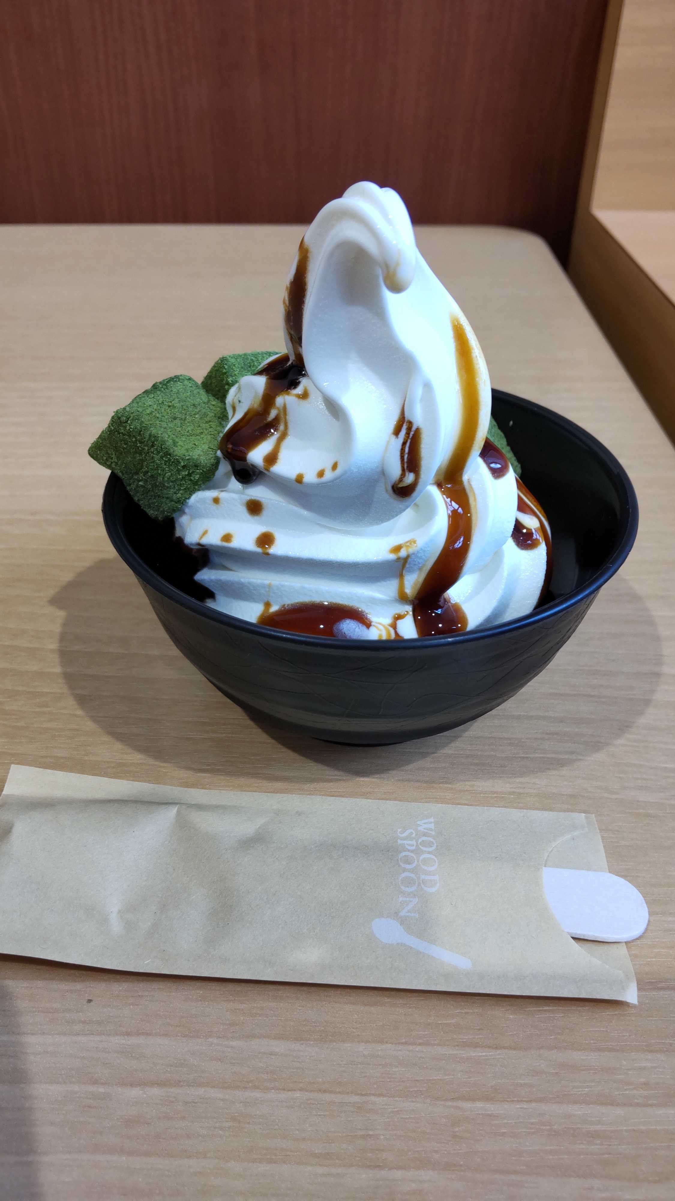 先日、宣言したアレを食べてきました😋抹茶わらび餅ソフト🍦去年のこの時期(写真を見たら9月だった)に食べて、トリコになったスイーツ✨ご当地スーパー「ヤマザワ」の、軽食コーナーひまわりで売っている夏のスイーツです🌻濃厚なソフトクリームに、黒蜜がかかっていて、隣には抹茶わらび餅がのっています🐱別角度からどうぞ( ゚∀゚)つさらに、上からのショット👀📷️✨まず、視覚👀から満足🈵😃✨涼しい店内とはいえ溶けてしまうので、写真撮影は早めに終わらせて。いただきま~す🍴🙏安定の、ソフトクリームの旨さよ😃家族が、イチオシのソフトクリーム🍦こんなに美味しいのにお財布にやさしいお値段なソフトクリームです。それから、黒蜜がかかった部分も食べた。黒蜜とソフトクリームも、合う~👍️トリコになる、魅惑の味💜抹茶わらび餅も🟩ちょうどいい食感&抹茶の風味がたまらん❗️ソフトクリームも黒蜜も抹茶わらび餅もひとつひとつ美味しくて、合わさって更に美味しい❤️大満足なスイーツでした✨来月いっぱいは販売しているんだろうか…?チャンスがあれば来月、また食べたい❗️時間もミソです。15時にソフトクリームの販売が終わるみたいなので、14時くらいに入店して食べるのがベストでした。…ずっと前(学生時代)、ファーストフード店でアルバイトしていた時、ソフトクリーム🍦作って提供していました。ソフトクリーム巻くのって職人技で、いい感じになるまで特訓&イメトレの毎日でした。だから、ソフトクリームを巻く人の苦労や気持ちがわかる(*-ω-)それを思いながら食べるから、なおさら美味しいですね。