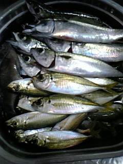 久しぶりに・・・今日は大漁だぁ!!! クロ3匹、サバ14匹、アジ33匹、ふふ、すごいでしょう? 早速、お料理の開始・・・ ☆アジのマリネ☆ アジはたっぷりの玉ねぎを入れたマリネ 今日はまだ骨まで柔らかくなっていないけど 玉ねぎはすっかり漬かってます! マリネの玉ねぎって、どうしてこんなに美味しいんでしょうね! パセリとオレガノを入れてるので、香りもグッド ☆ごま鯖☆ サバ5匹で、黒ごまたっぷりの ごま鯖 を作りましたぁ 茶漬けにしても良いけど、私はわさびをのっけて、そのまま食べます 砂糖、しょうゆ、ミリン、胡麻に漬け込むだけでできます ☆鯖の甘露煮☆ 残り9匹のサバは、ぶつ切りにして生姜たっぷりの甘露煮に・・・ 圧力釜を使ってるので、短時間で骨まで柔らかくなり しっかり中まで味がしみ込んで美味しいです! クロ3匹は、煮付けように処理して、冷凍庫へ・・・ そうそう、骨も無駄にしてはいけませんね・・・ ☆鯖の骨せんべい☆ いつも作ってる骨せんべい ほんのちょっぴり小麦粉をまぶし、低温でじっくりと揚げます 揚げ上がりに、塩コショウをパッパッ! ウソみたいに、サクサクポリポリ! 骨ごと漬け込んだり煮たりしたので、ゴミはほんの僅か・・・ 釣ったばかりのお魚、ごま鯖は絶品ですよー サバなのに、全く生臭さもなく、コリコリ やっぱり、新鮮さが一番のご馳走ね♪