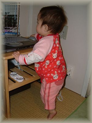 昨日からお熱を出しているモコです昨晩は38.7℃まであがっちゃってかなりあせりましたが、今朝復活今日は36.9℃で平熱になったけど、お鼻がダラダラ~。可哀相だけど、頑張って治してねモコ2~3日前からモコがつかまり立ちして手を一瞬離すようになりました。旦那さんと「もう立つかね~?」と話していたら・・今日一人でたっちしました旦那が仕事にいった直後、いつもの四つんばいになって段々と手が床から離れていく~ふるふるしてたけど、なんとか直立し気持ち得意げな顔この写真を撮ったのは二回目の時なんだけど、よそ見までする余裕っぷり。パジャマですんませんでも立ってるの~私はかなり感動しビデオをまわしたり、涙ぐんだり非常に忙しかったですつかまりだちは結構早い時からしてたのに、いっこうに自分で立とうとしなかったモコ。ハイハイが超早くなるばっかりで、私もやきもきしていた頃の出来事でしたああ・・子育てって楽しいな