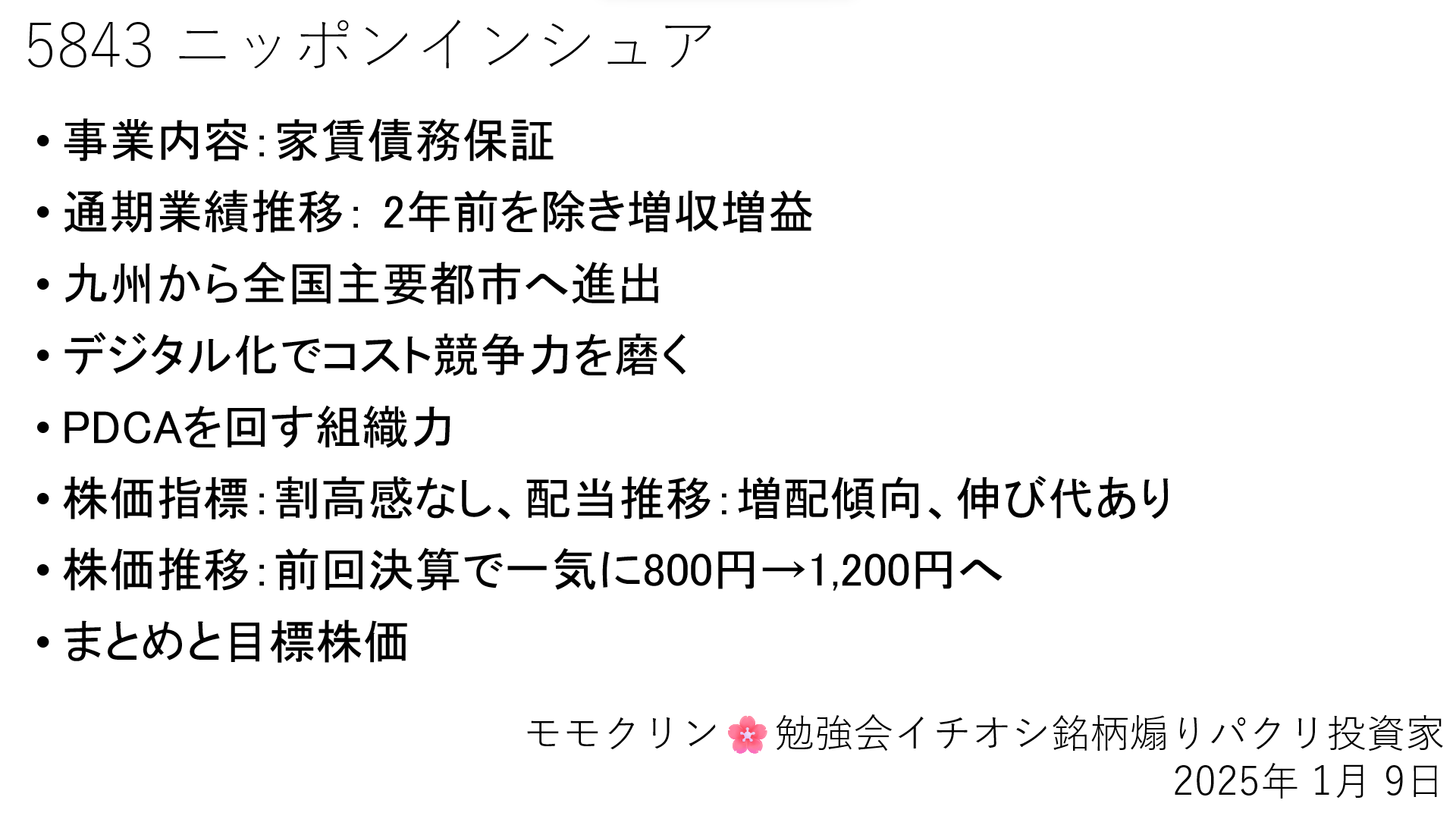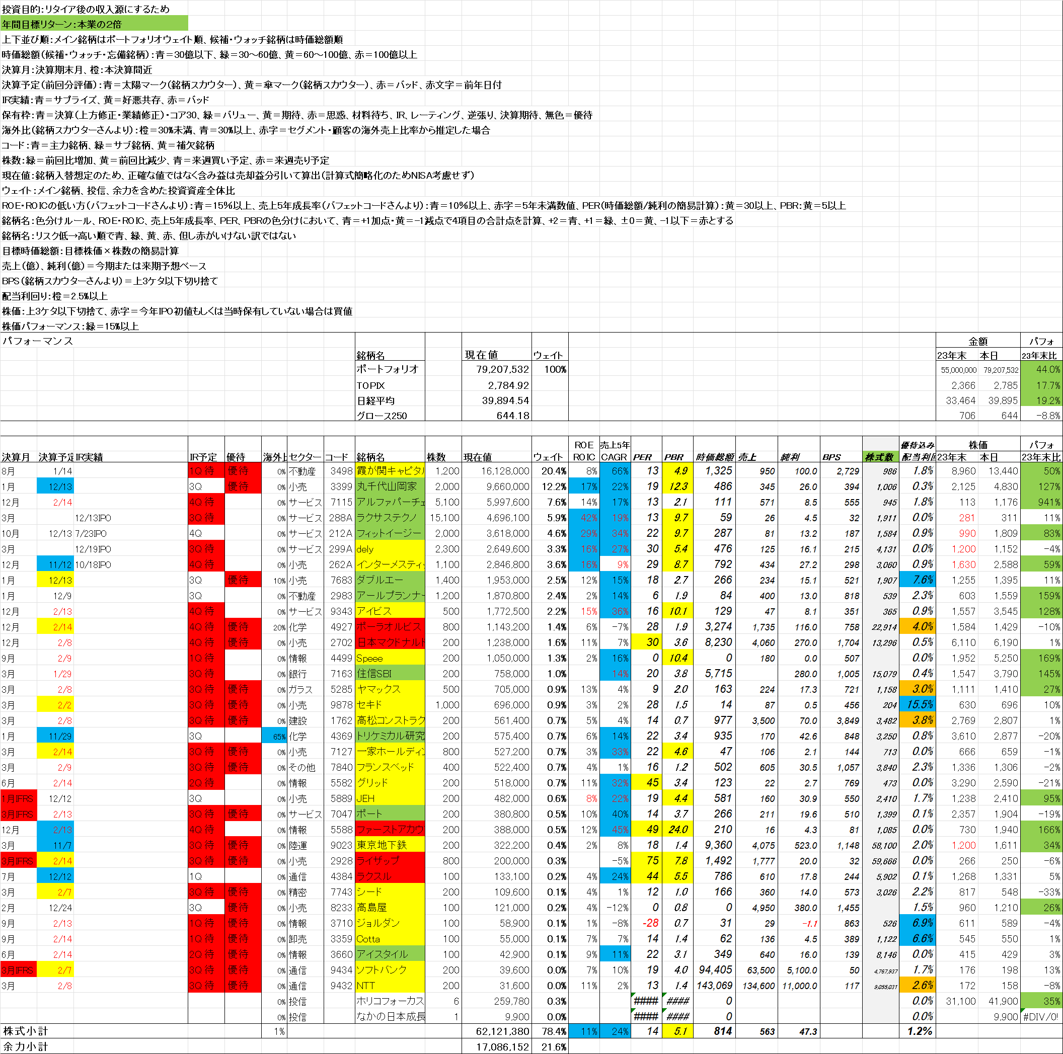 〇年初来パフォTOPIX+17.7% 日経+19.2% グロース250-8.8%、保有株+44.0%〇振り返り・ご無沙汰しておりました、1年ぶりの更新です。IR実績欄はスカスカ、しかも候補・ウォッチ・忘備の各銘柄は表からも消え去るというふがいない状態で大変申し訳ありません。毎週更新していたコロナの頃がはるか遠い昔話のようですが、最低でも年初の更新は今後も続けていくつもりです、よろしくお願いします。・去年は年初から4月の霞が関2Q決算まで絶好調で年初来+56%のYHをマーク、その後5月に控えめ予想を出す本決算銘柄を安易に跨いでからドローダウンが始まり、あの8月5日のブラックマンデーを迎えて年初来+20%で底打ち、その後多くの悪あがきを続けながらなんとか生き残り年初来+44%のフィニッシュでした。霞が関が7,950円ストップ安気配で引けたあのブラックマンデーを乗り越えて、去年に続き退場させられずに済んだだけでなく指数アウトパフォームまでできたのは上出来です。・ちなみにおととし年末のポートフォリオから去年1年間脳死ホールドしていた場合の仮想パフォは+20%でした。 〇意気込み・数年前にどこかで読んだのが、若いサラリーマンが社内でぱっとしない年配の窓際族を見くびっていたら、実は副業の不動産で本業の2倍以上稼いでいたことを後で知って驚いたというような話。定年が徐々に身近な事として近づきつつある自分としては、株式投資で本業の2倍以上稼ぐのを密かに目標としてきました。この目標が継続して達成できれば、経済的な不安を抱えながら定年を迎えてリタイヤしなくても済むような気がするためです。おととしはクリア失敗で去年はクリアできた恰好です、まさか去年達成できるとは思いもよらなかったのが正直なところではありますが、、、・さて今年は\1M強家計へ出金して元本\78Mでスタートです。元本アップにより去年に比べ目標達成へのハードルは低くなっていますが、連続達成に向けて今年ももがき続けていきたいと考えてます。・パフォは霞が関のウェイトが去年の半分以下となったため、決算・IPO・カタリストなどでアップサイド30%期待銘柄をウェイト10%で保有してトータルパフォに3%貢献というパターンで何銘柄取れるか次第かな?と思いますので、良さげな銘柄あったらシェア、よろしくお願いします。〇ポートフォリオフォーマット更新(緑塗りつぶし)年間目標リターン:本業の2倍