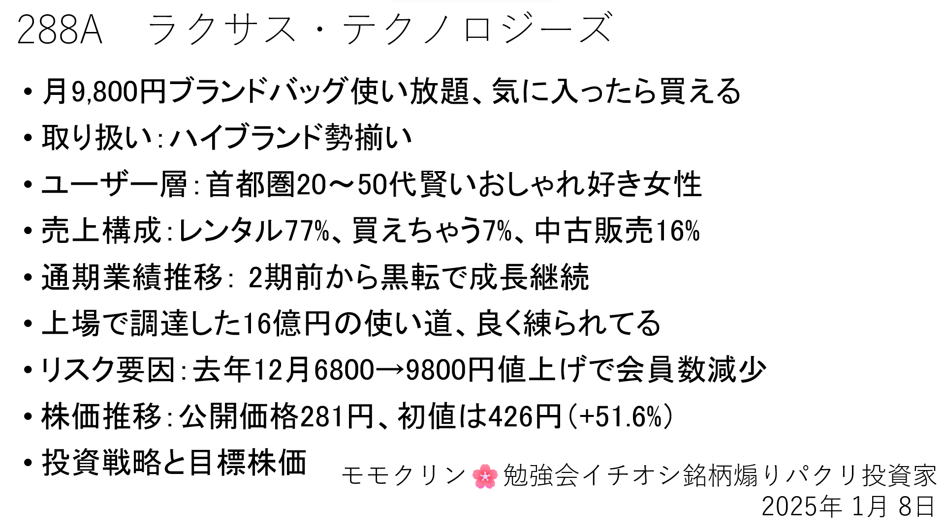 昨日勉強会で発表して参加者の方から教えてもらったのだが、みん評というサイトの口コミがあまりよろしくないことが分かった。ラクサスの口コミ・評判(226件) | みん評バッグを返したら使う前からもともとついていた汚れをつけたということで請求を受けたという類の話が複数あるので、IRに確認してみようと思う。それにとエアークローゼットを使っていた人から「エアクロを使っているということを知られたくない」という話を聞いたらしく、確かにラクサスも同様に感じる人はいそうと思った。