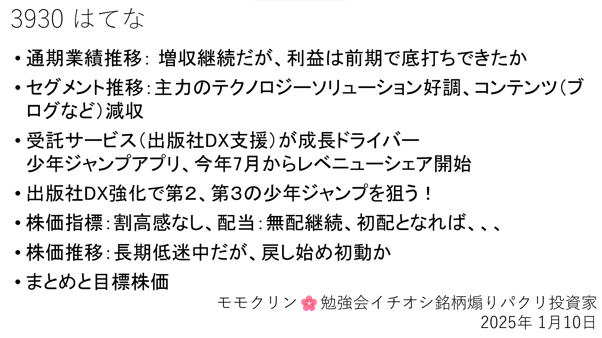 今年の2倍株銘柄で結構自信持って出した銘柄ですがHPから問合せしたのは、確か先週の頭だったかな?先程到着したが、問合せしたことさえ忘れてた回答当社は当期純利益を計上しておりますものの、未だ内部留保が充実しているとは言えない状況です。また、当社は10期以上連続で増収を続けており、引き続き成長過程にあると考えております。内部留保の充実を図り、企業体質の強化、事業の効率化と事業拡大のための投資等に充当し、なお一層の事業拡大を目指すことが、株主の皆さまに対する最大の利益還元に繋がると考えております。事業の拡大については、3期後の2027年7月期の売上高50億円、経常利益率10%を経営目標として- 1. 出版社DX支援への注力- 2. 新サービスのグロースとMackerelのプロダクト転換- 3. 技術開発投資による既存サービスの進化上記3本を柱に進めて参る計画です。所感内部留保がまだ充実してないの?→だったらどれだけになるのを目指しているのか?言ってくださいな増収継続というだけで成長過程の認識なの?→世の中ほとんどみんなになるよ結論要するに資本コストが意識されていないのかな?そういう自分も分かってないけど、、、これじゃこの会社の株主に対する姿勢が見えない、まだ投資はできないこのまま今年2倍になっても嬉しくないし
