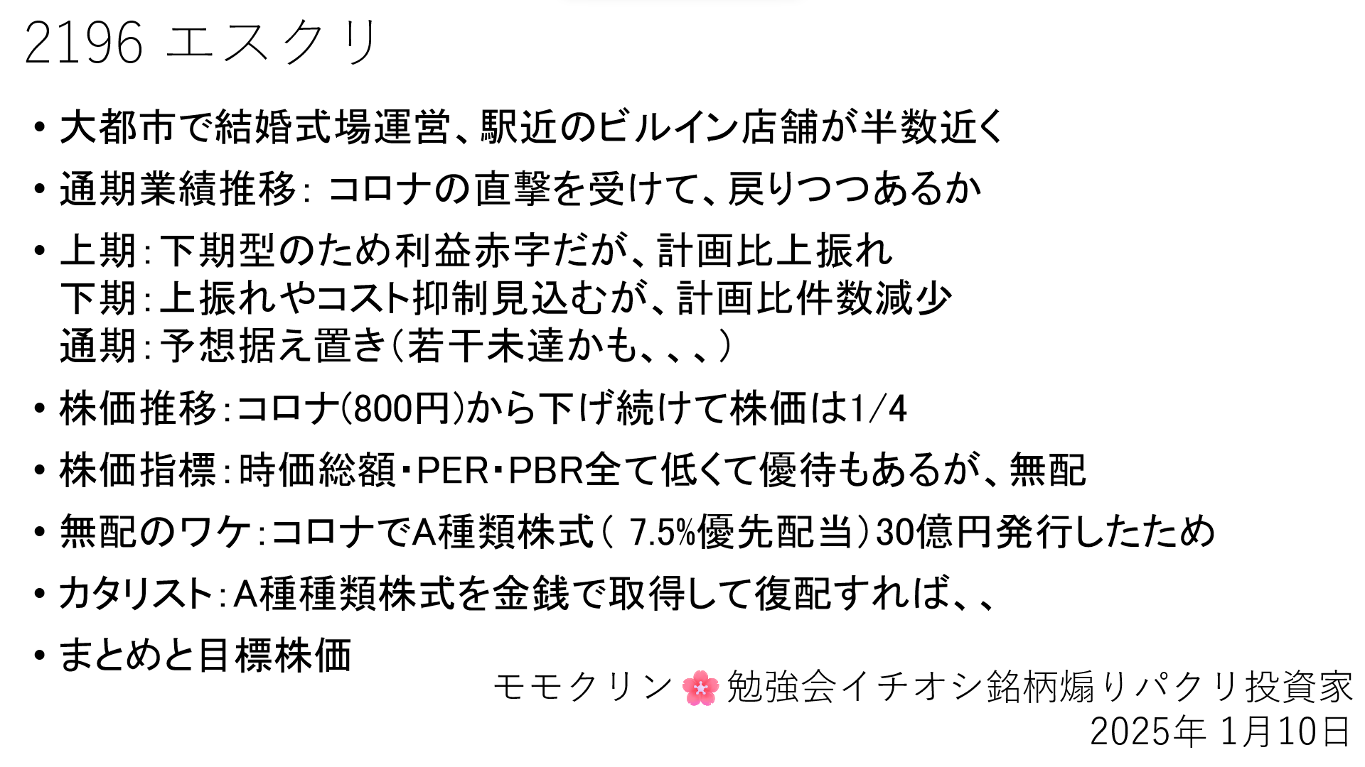 2倍株で出したシナリオでA種種類株式買い取りと復配の期待としたところ、種類株の買い取りはあり得ても復配までは欲張り過ぎとありがたいご指摘を頂戴してました。ところが昨日三井住友ファイナンスリースからティーケーピーが買い取りという予想外の展開がありました。背景で、ティーケーピーと資本業務提携契約しており法人顧客を当社施設へ送客いただくことによる宴会利用等の平日稼働率向上やティーケーピーの新規出店・改装工事を受託するなど、業務提携の成果を挙げて良好な関係性を両社と築いてまいりましたが、ティーケーピーとの業務提携を更に進化させることに加え、今後の当社の中長期的な経営基盤の安定を企図すべく、と触れられてます。この先何か良さげなことがありそうなと期待。優待枠保有から増やしておきたいと考えてます。140120250110549579.pdf